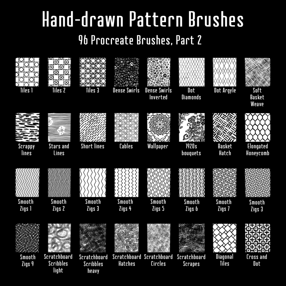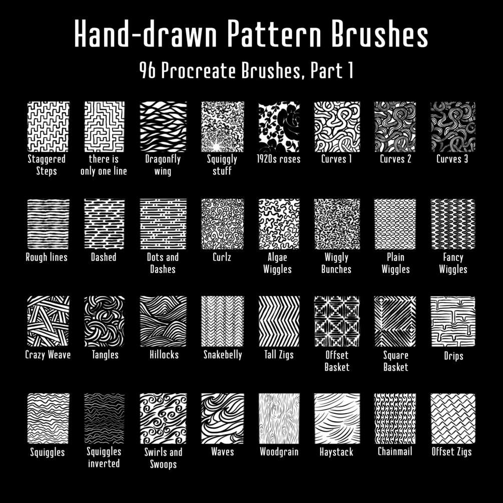 This is a Procreate brush set, which includes 96 brushes (and which will include any further brushes of this sort that get made). If you have already purchased the original Hand Drawn Pattern Brushes or (more) Hand Drawn Pattern Brushes, you already have some of these brushes, but this pack will get new pattern brushes of this sort as they are created.