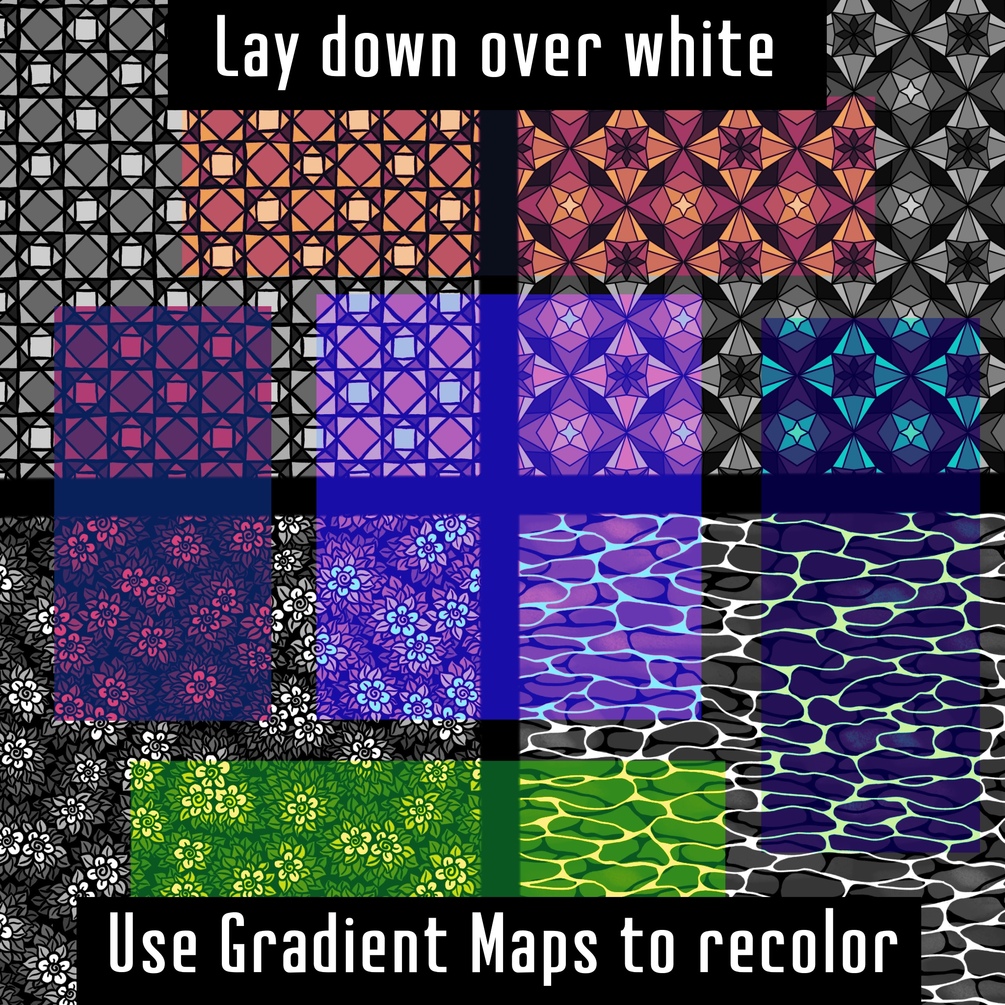Gradient maps + Grayscale pattern brushes over white = quick and interesting backgrounds and textures in multiple colors!